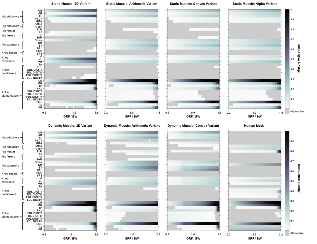 Interestingly, all Lucy models showed similar muscle activation patterns, but the maximum vertical force the limb could withstand varied amongst the models. Static muscle models struggled to support the weight, whilst dynamic models performed better, suggesting that incorporating more realistic muscle properties improves the strength of the model – although the latter does come at a modelling computational expense.